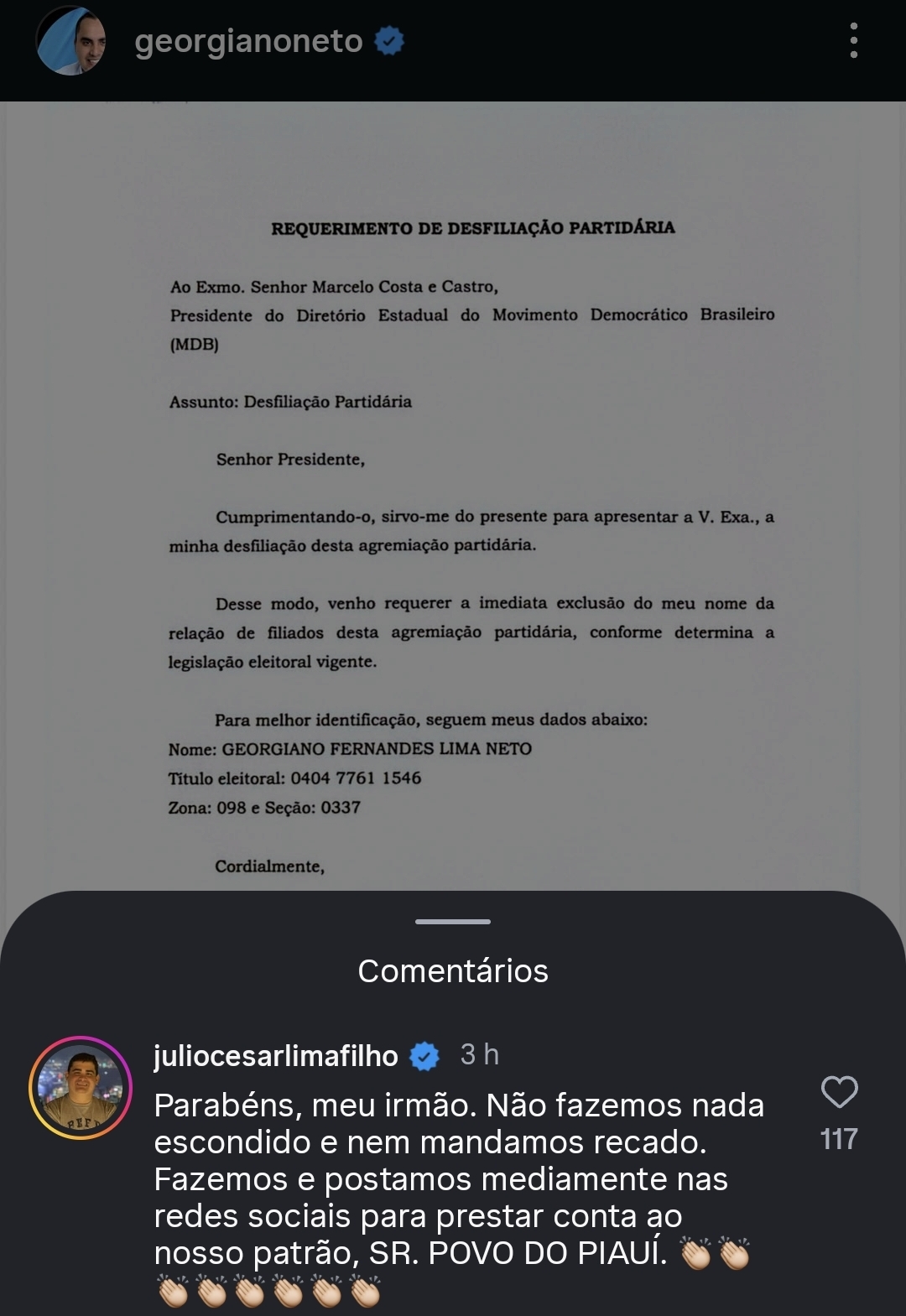Agora quem reagiu foi o pré-candidato a deputado estadual Júlio Filho, filho do deputado federal Júlio César Lima, que é pré-candidato ao Senado. Em comentário na publicação do irmão, ele parabenizou Georgiano pela decisão de pedir desfiliação do MDB e criticou a forma como, segundo ele, o partido conduziu o rompimento da chamada “fusão cruzada” entre os partidos.