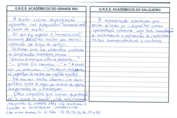 No subquesito “canto da escola”, o documento afirma que integrantes de diversas alas desfilaram sem cantar o samba e de forma inexpressiva. Foram citadas nominalmente as alas 09, 12, 18, 19, 20, 22 e 23.