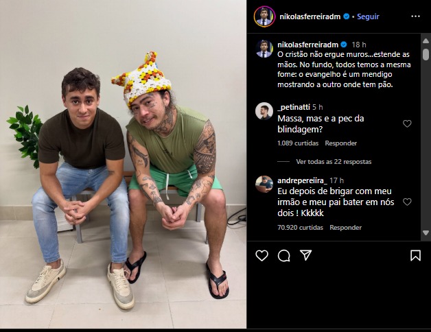 Depois de uma semana cercada de polêmicas e uma troca de farpas digna de uma Guerra Fria versão Twitter, Nikolas Ferreira e Whindersson Nunes parecem ter selado um acordo de paz. O gesto de trégua veio em forma de um foto publicada pelo parlamentar na tarde deste sábado (20), com a seguinte legenda: