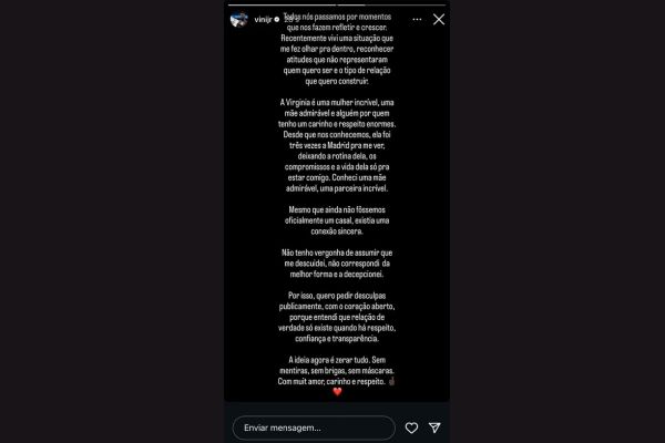 Vini Jr., de 25 anos, se manifestou pela primeira vez sobre o fim de seu envolvimento com Virginia Fonseca, de 26. O atacante do Real Madrid usou seus Stories do Instagram, na noite desta quarta-feira (8), para fazer um desabafo e reconhecer seus erros no relacionamento com a influenciadora.