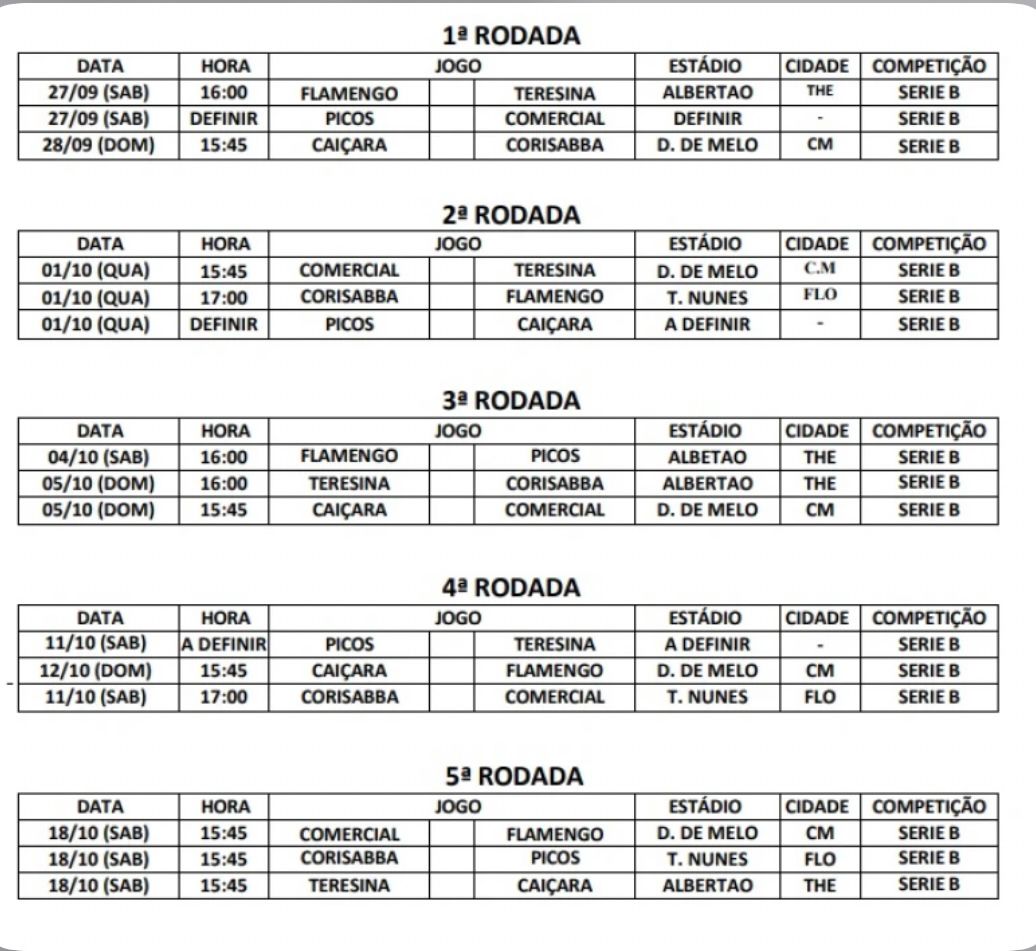 A Federação de Futebol do Piauí (FFP) divulgou nesta quinta-feira (21) a tabela completa da Série B do Campeonato Piauiense 2025. A competição terá início no dia 27 de setembro e contará com seis clubes tradicionais do estado: Flamengo, Caiçara, Picos, Comercial, Teresina e Corisabbá.