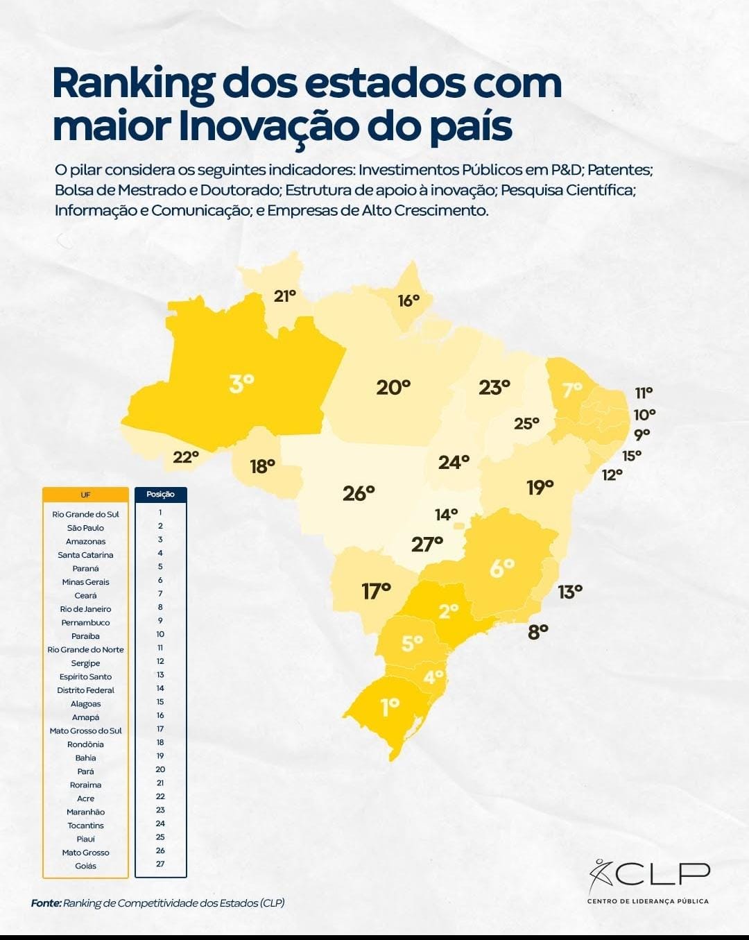 Um levantamento divulgado nesta semana pelo Ranking de Competitividade dos Estados, realizado pelo Centro de Liderança Pública (CLP), indica que o Piauí é o terceiro pior estado em inovação e tecnologia. O levantamento avalia o desempenho dos estados em áreas estratégicas como pesquisa científica, tecnologia, empreendedorismo e desenvolvimento de empresas inovadoras.