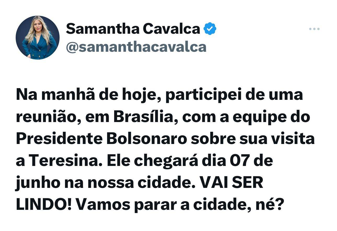 O anúncio foi feito por Samantha em uma postagem em suas redes sociais. Conforme a apresentadora, ela esteve reunida com a equipe do ex-mandatário, para definir detalhes da vinda de Bolsonaro ao território piauiense.