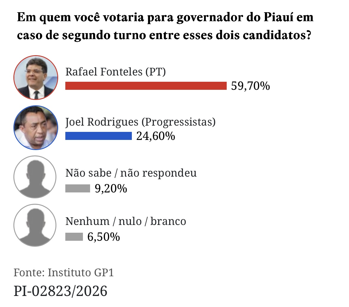 Uma pesquisa divulgada nesta segunda-feira (13) aponta os números de um possível segundo turno para o Governo do Piauí. No cenário estimulado, o governador Rafael Fonteles aparece com 59,7% das intenções de voto, enquanto Joel Rodrigues soma 24,6%.