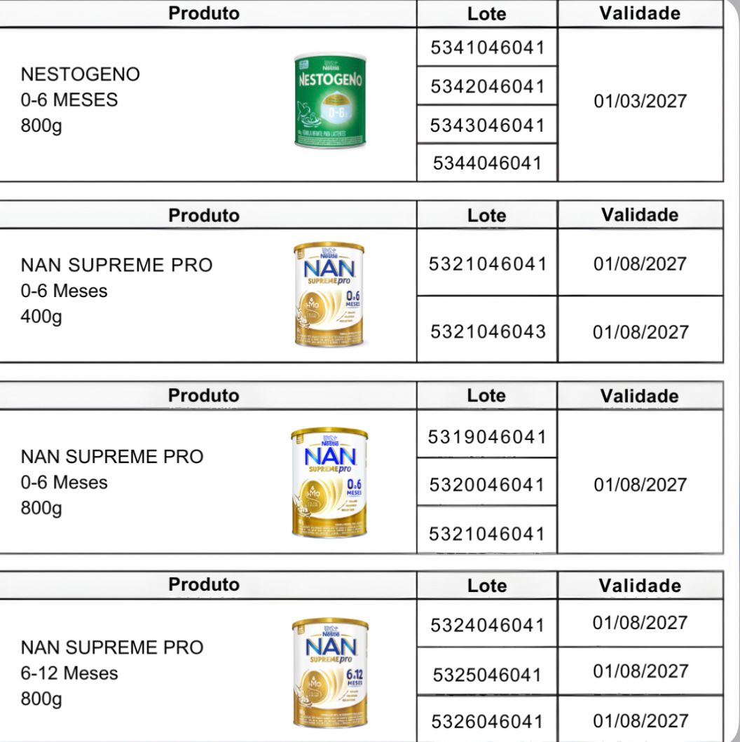 A Agência Nacional de Vigilância Sanitária (Anvisa) determinou a proibição da venda, distribuição e uso de alguns lotes de fórmulas infantis da Nestlé Brasil. A decisão consta na Resolução nº 32/2026, publicada nesta quarta-feira (7), e envolve produtos das marcas Nestogeno, Nan Supreme Pro, Nanlac Supreme Pro, Nanlac Comfor, Nan Sensitive e Alfamino.