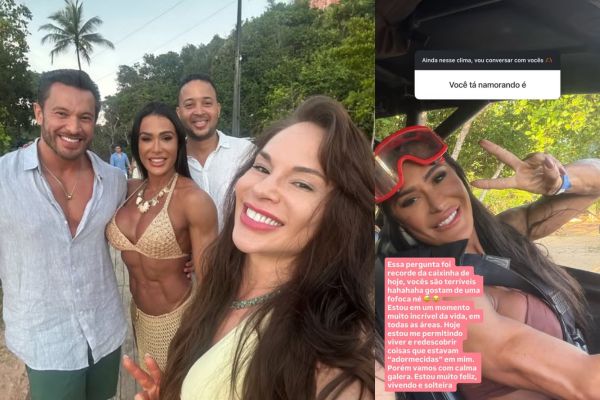 Com bom humor, Gracyanne explicou que, apesar de estar vivendo um momento especial, segue solteira. “Essa pergunta foi recorde da caixinha de hoje, vocês são terríveis, gostam de uma fofoca, né?”, brincou. Em seguida, falou de forma mais profunda sobre a fase atual: “Estou em um momento muito incrível da vida em todas as áreas. Hoje, estou me permitindo viver e redescobrir coisas que estavam ‘adormecidas’ em mim. Porém, vamos com calma, galera. Estou muito feliz, vivendo e solteira”.