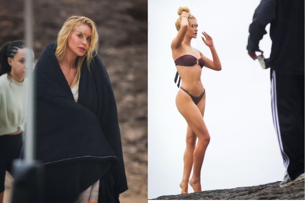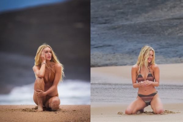 Com sensação térmica de menos de 20ºC, Marina precisou se aquecer entre um clique e outro com mais de um cobertor, enrolando-se para tentar espantar o vento. Mesmo assim, não hesitou em cumprir o trabalho: deitou na areia molhada, posou sobre pedras frias e exibiu diferentes modelos de biquíni — alguns de lacinho — em tons que iam do marrom escuro ao off-white