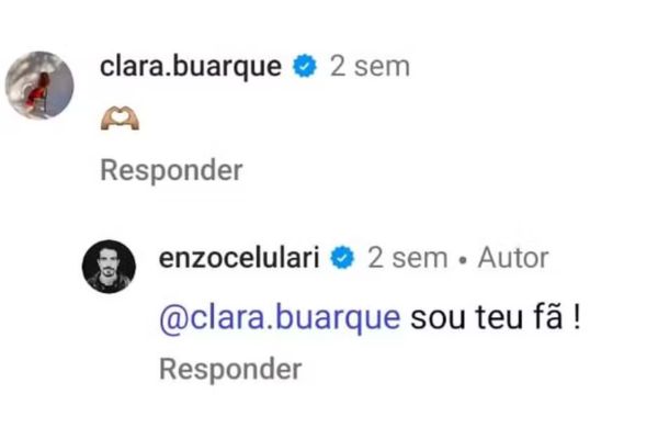 Antes mesmo do flagra, Enzo e Clara já vinham chamando atenção pela troca de mensagens e curtidas nas redes sociais. Recentemente, o filho de Claudia Raia e Edson Celulari comentou em uma foto de Clara e do cantor Tom Veloso com a frase: “Sou teu fã”. A artista respondeu com emojis de coração, levantando suspeitas de aproximação.
